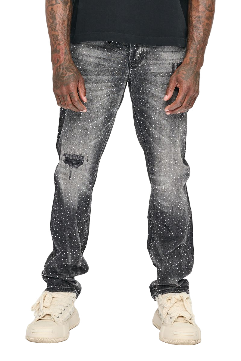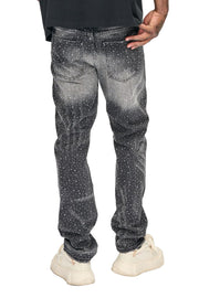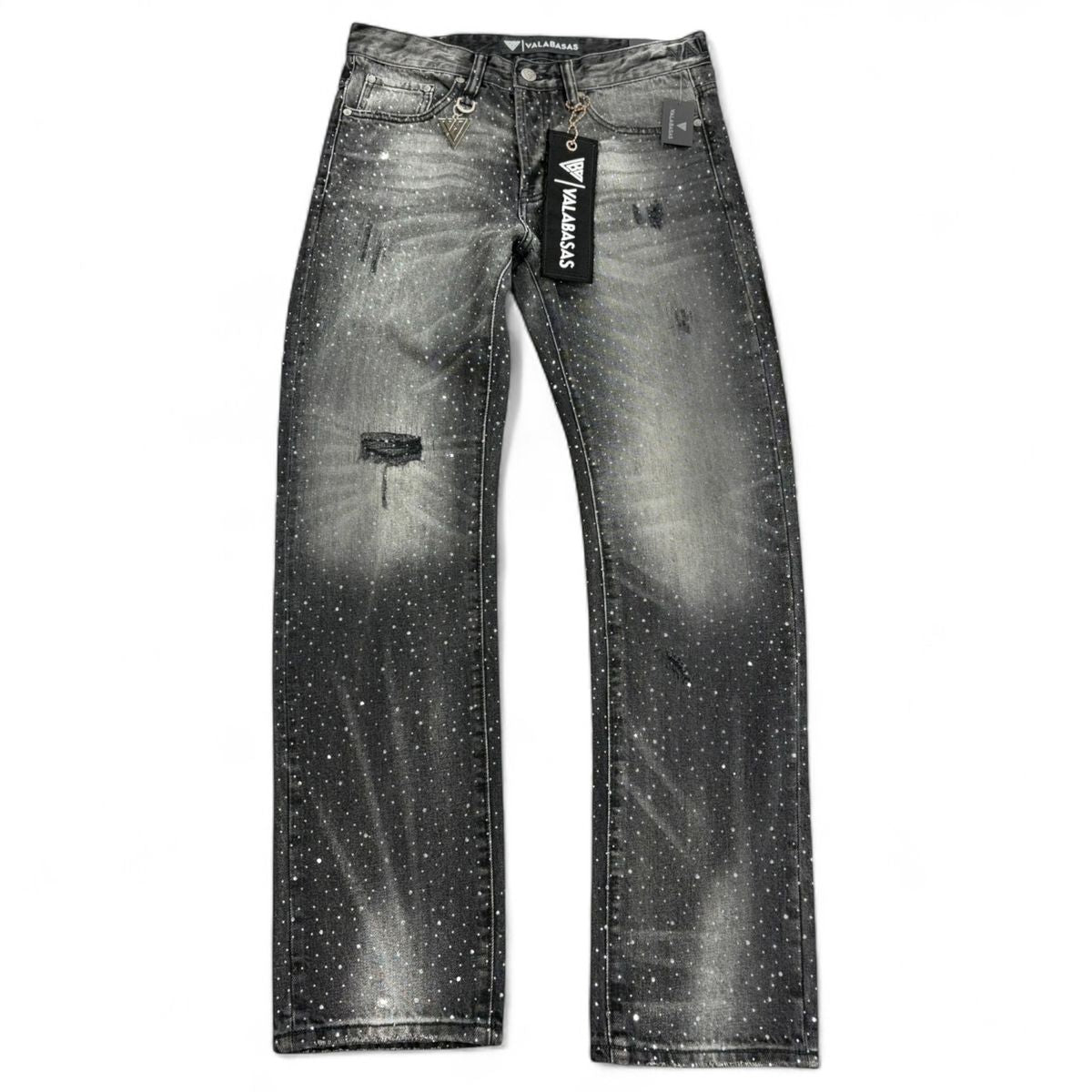 The VALABASAS Degen Straight Denim in Vintage Black brings texture, grit, and light into balance. Featuring a galaxy-inspired speckled finish across a vintage wash, this jean captures a lived-in aesthetic that feels both raw and refined. The subtle distressing at the knee and natural fading complete the look, embodying the effortless edge of modern street luxury.