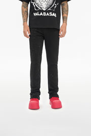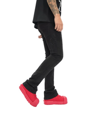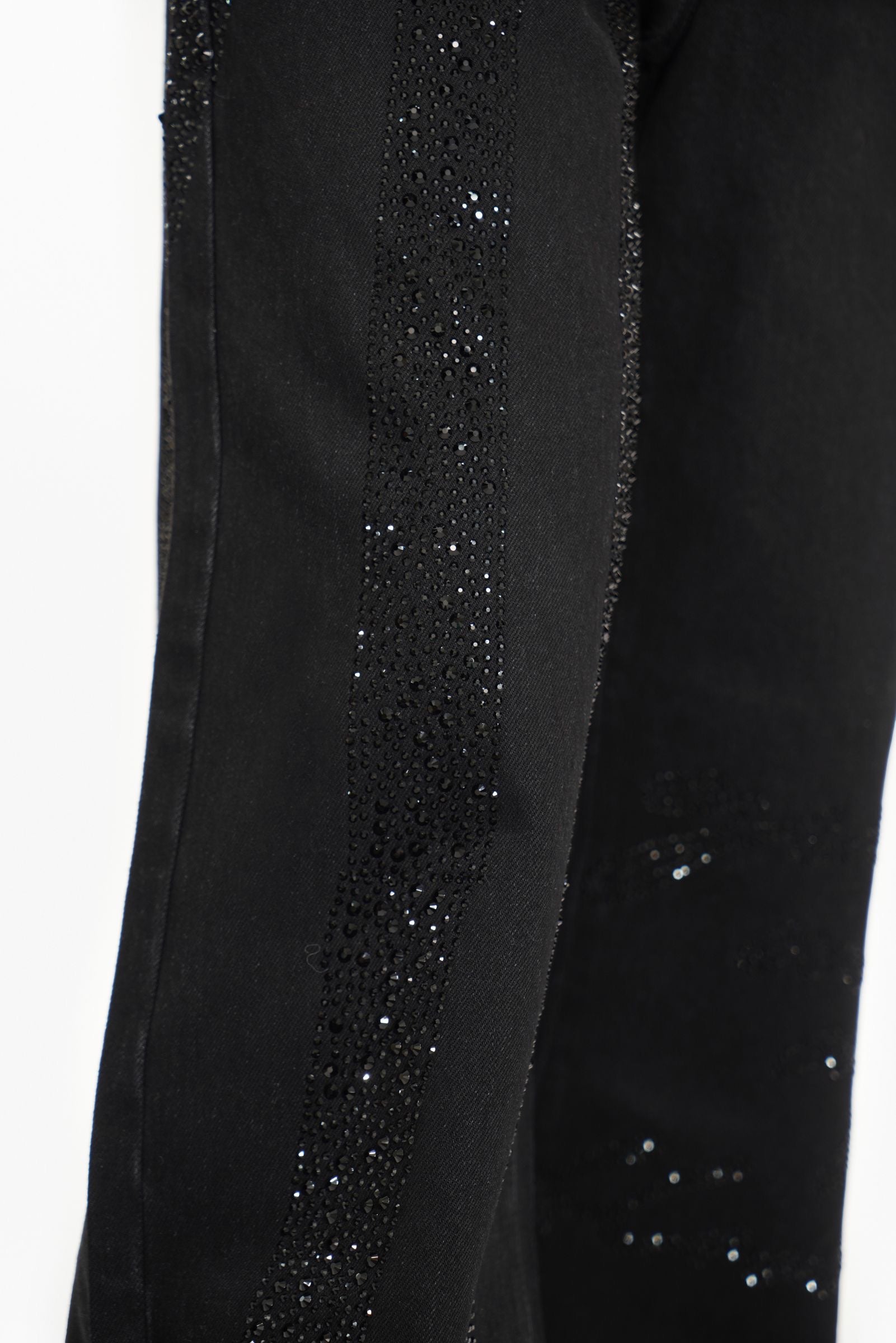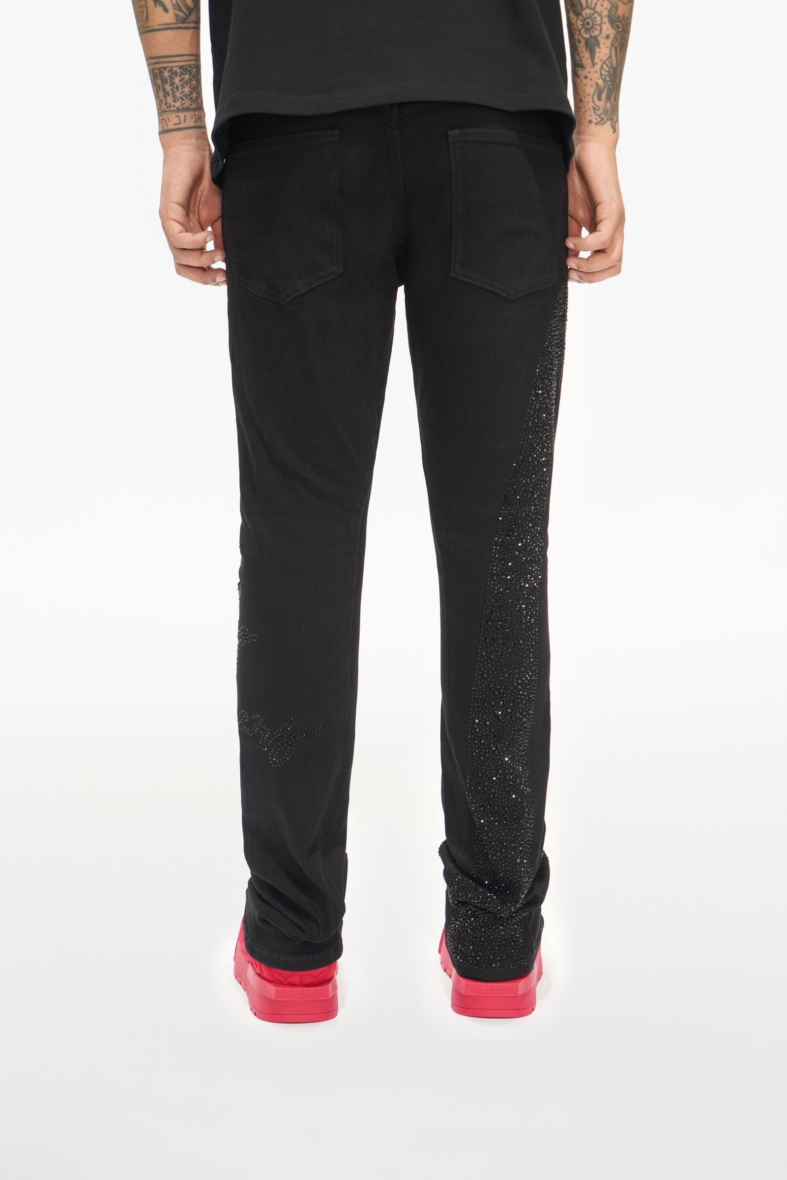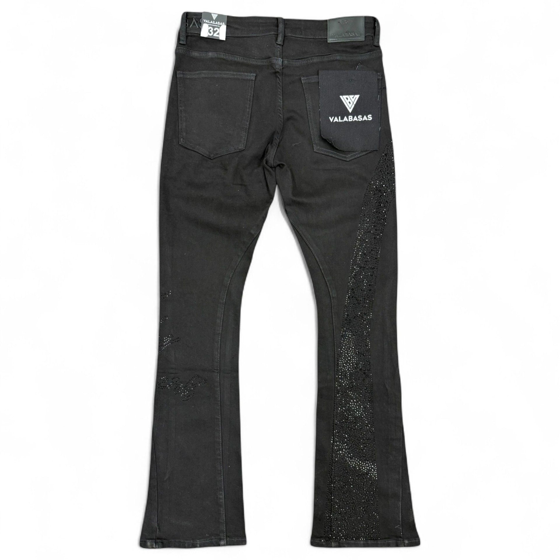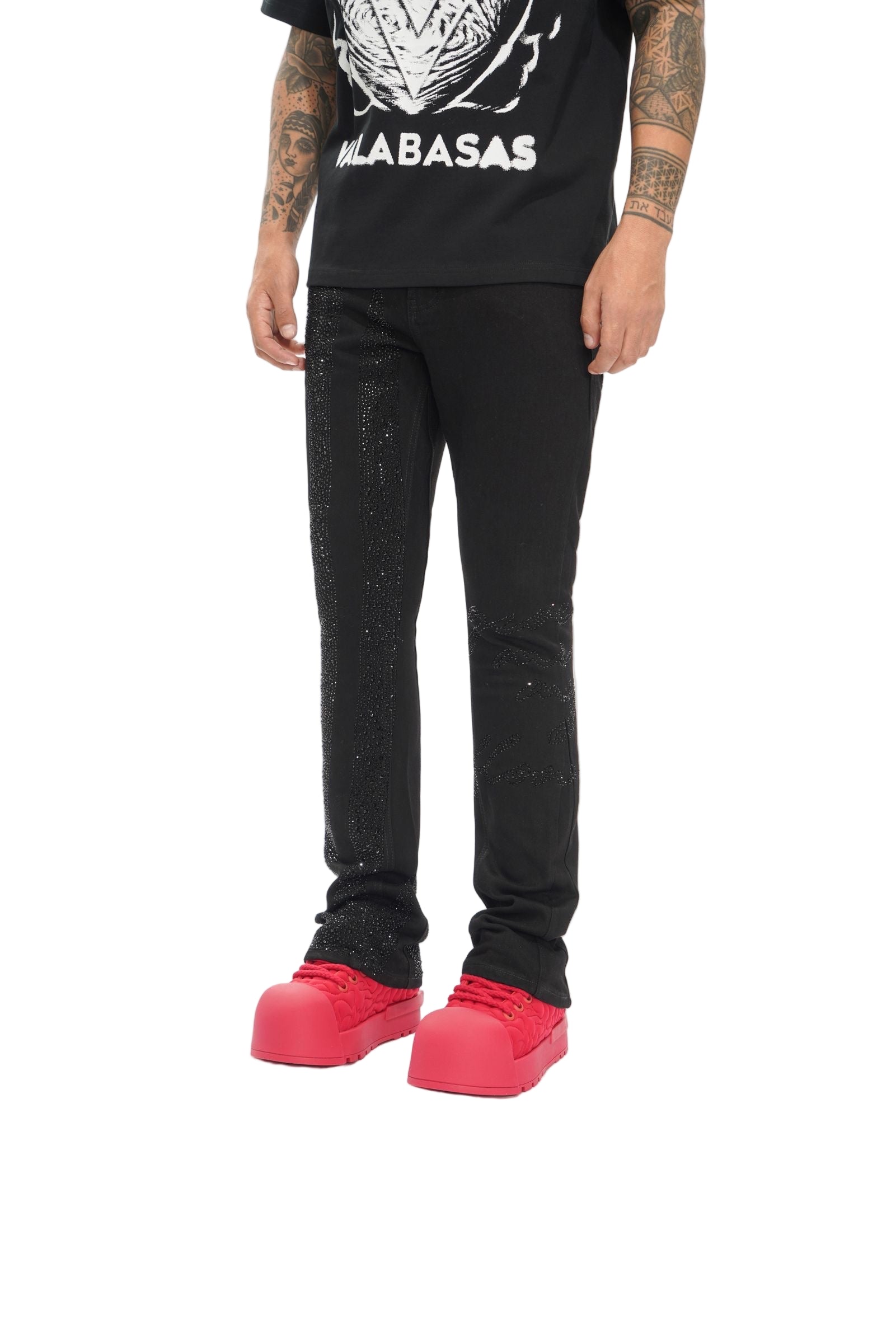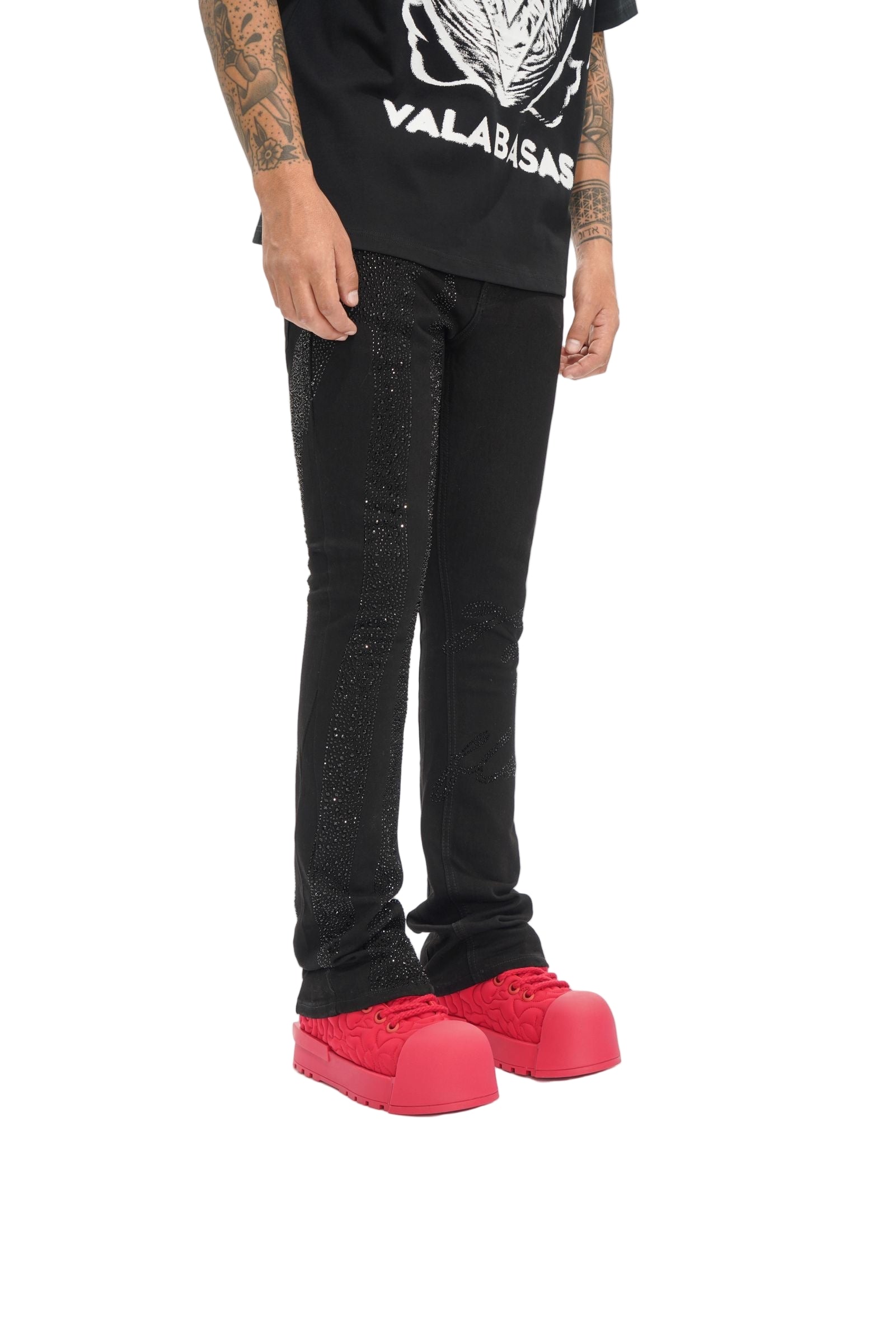 The VALABASAS Scripted Denim in Black Stacked fuses artistic expression with modern minimalism. Designed in a sleek stacked fit, these jeans feature tonal rhinestone script detailing that catches the light with every move — subtle yet powerful. Crafted from stretch denim for comfort and structure, this piece embodies the statement-making refinement of luxury streetwear.