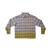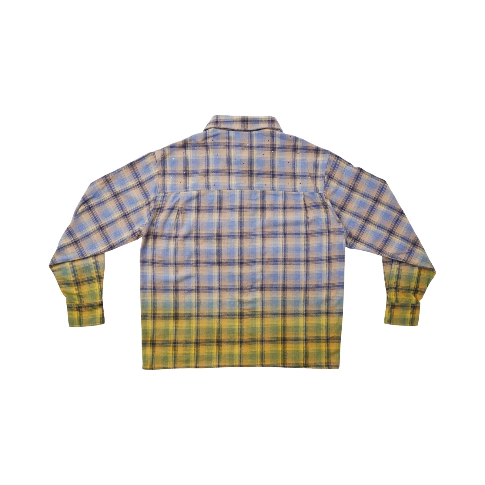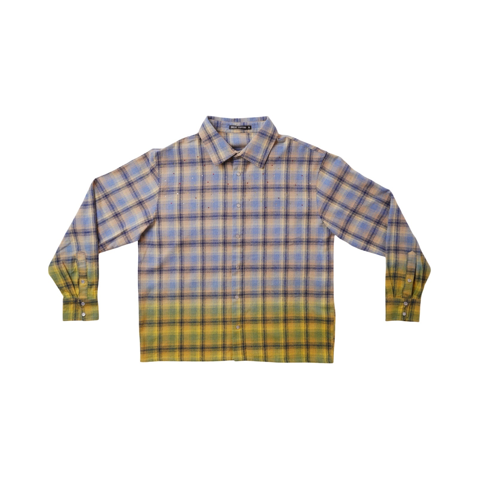 The “Shooting Stars” Flannel by SILNT CHPTRS delivers a standout twist on a classic plaid. Crafted from soft, midweight cotton, this button-up shirt blends comfort and statement style. The gradient blue-to-yellow wash creates a bold ombré effect, while subtle distressing adds a worn-in, vintage edge.