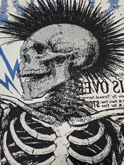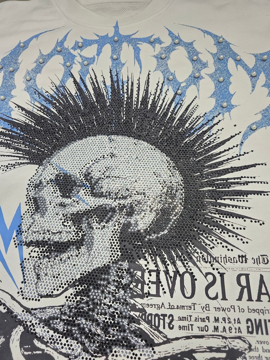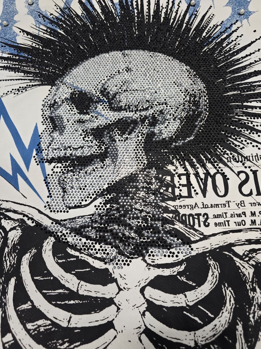• Front: Large skeleton punk graphic layered with lightning and newspaper-style details