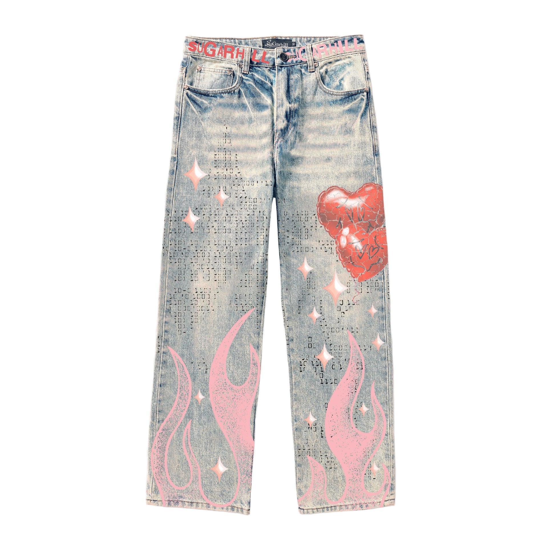 The Sugarhill “Disco” Relaxed Fit Jeans in Blue Wheat deliver a bold take on classic denim with signature graphics and standout details. Crafted from premium washed denim, these relaxed fit jeans feature a light blue wheat wash accented by vibrant pink flames, sparkling star graphics, and a red heart motif on the leg. The custom Sugarhill logo waistband adds an exclusive branded finish.