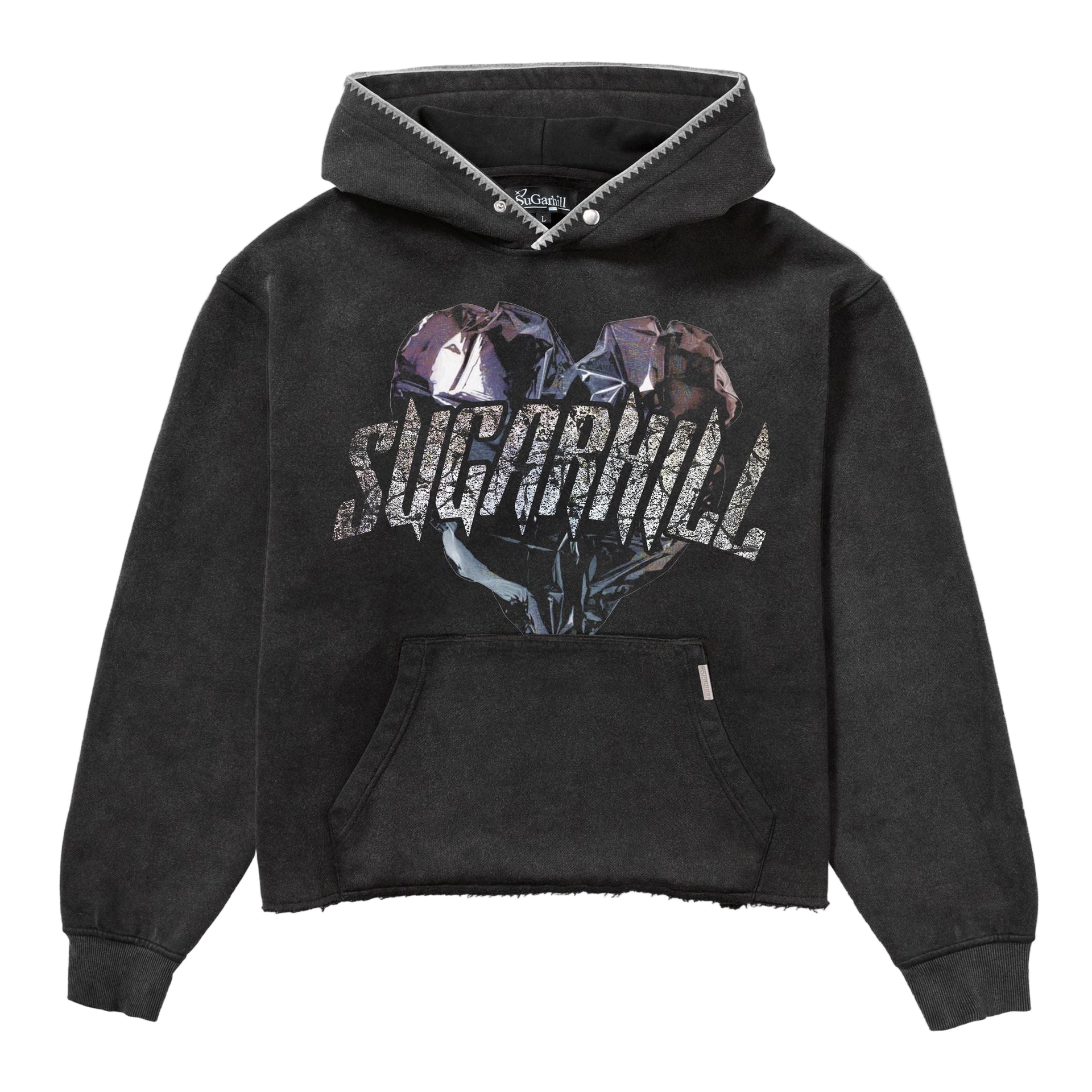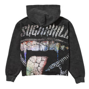 The front showcases Sugarhill’s signature logo over a cracked chrome heart design, while the back commands attention with a larger-than-life graphic of vampiric teeth, complete with striking metallic tones and gothic detailing. Faded wash fabric gives the hoodie a worn-in, vintage appeal, while ribbed cuffs and a kangaroo pocket balance style with everyday comfort.