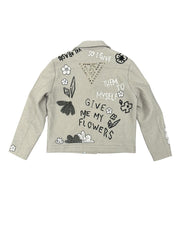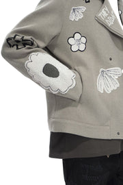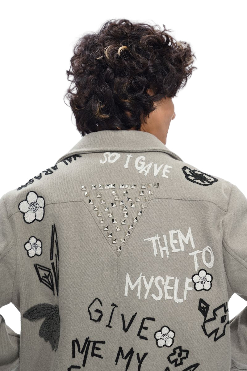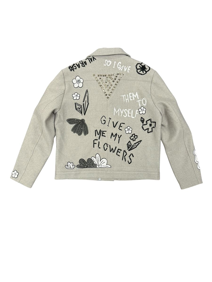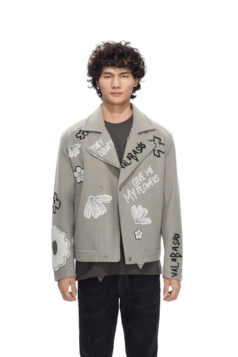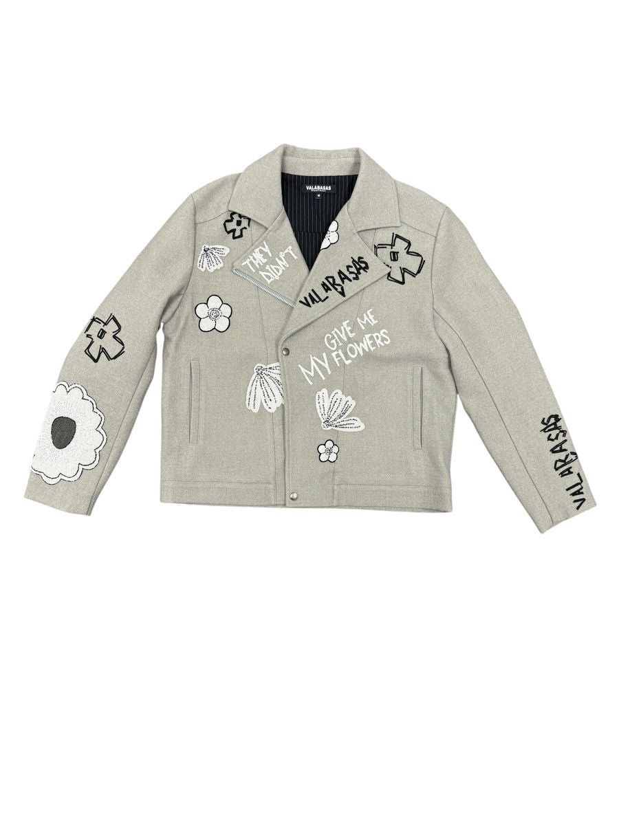 The VALABASAS Selfmade Jacket in Grey blends artistic flair with structured streetwear design. Crafted from a premium wool blend, it features hand-drawn style embroidery reading “They didn’t give me my flowers” alongside bold VALABASAS branding and floral motifs. With its sharp collar, relaxed fit, and statement stitching, this jacket embodies confidence and creativity — for those who make their own lane.