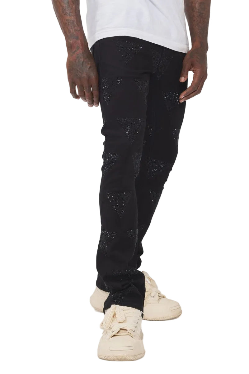 The Valabasas Show Jet Black Jean delivers a clean silhouette with subtle statement detail. Crafted in a deep jet-black wash, this pair features tonal textured accents throughout that add dimension without overpowering the look. Designed with a slim, stacked fit, the jeans fall naturally at the ankle for a modern finish that pairs effortlessly with sneakers or boots.